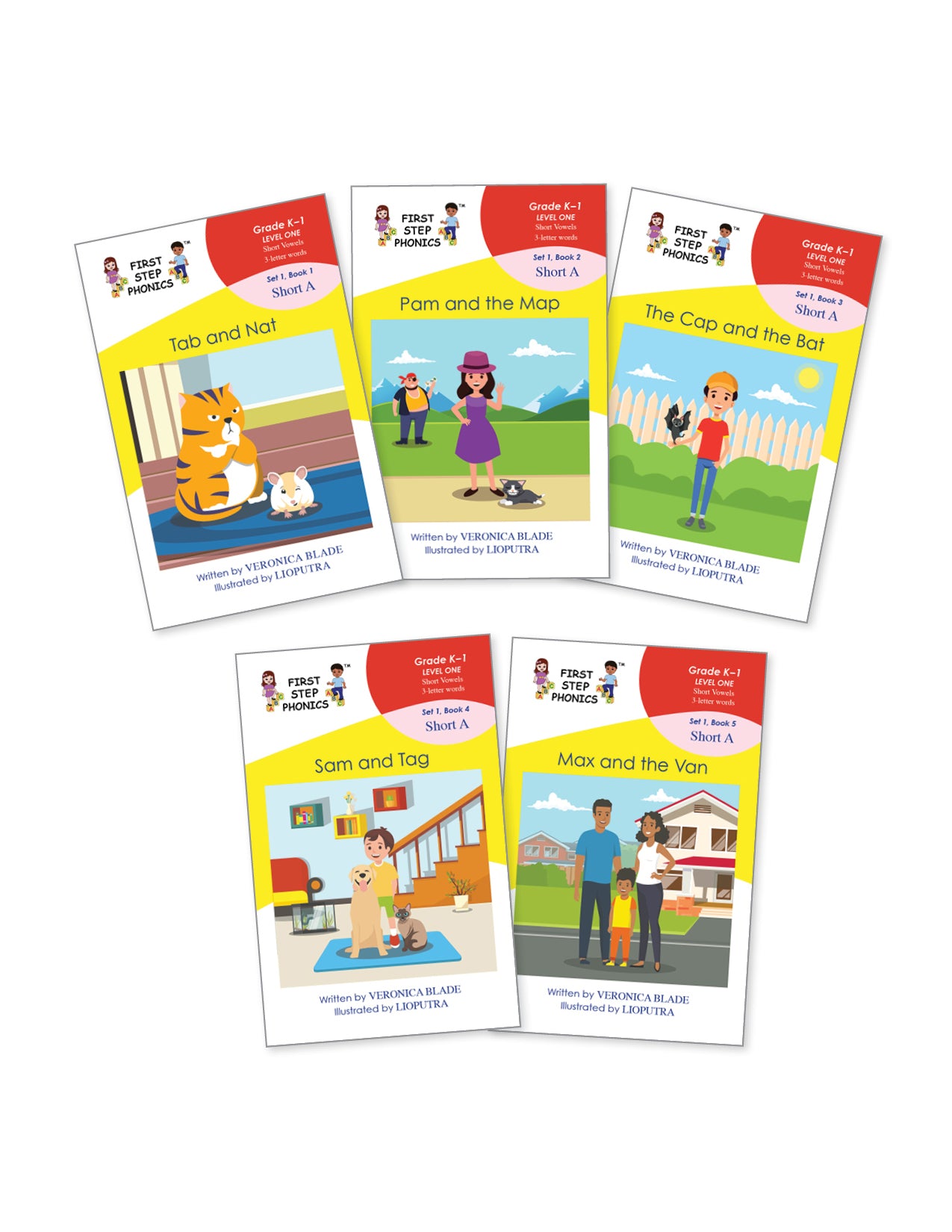 Level 1 focuses on stories with three-letter words containing short vowels. Each book is 8.5 x 5.5 inches and contains sixteen pages of story (on rare occasions fifteen pages).